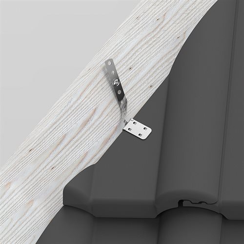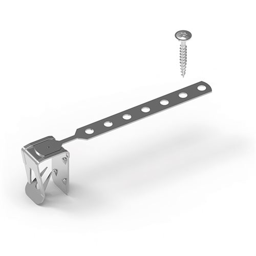 Durch ihre vier Kragen und zwei Krallen bietet diese Klammer selbst auf unebenen Oberflächen oder bei Dachpfannen mit eingeprägter Schrift auf der Rückseite einen 100 % sicheren Halt. Sie ist mit einem leicht biegsamen Lochstreifen aus Edelstahl und integrierter SPAX®-Schraube für die Befestigung am Grat oder an der Kehle ausgestattet. Die 512 lässt sich einfach einsetzen und sicher an der Dachlatte befestigen. Das Durchbohren der geschnittenen Dachpfannen wird somit überflüssig, was zu einer Zeitersparnis bei der Verlegung an Grat und Kehle führt.