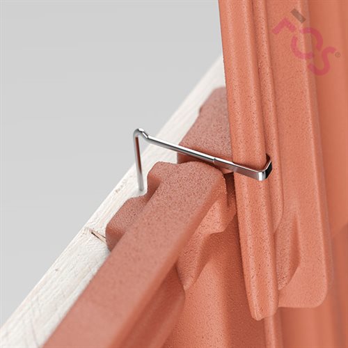 FOS bietet mit der Sturmklammer 409® starken Halt auf dem Dach und garantiert einen hohen Widerstand gegen Windsogbelastung. Als Einschlagklammer ist sie für alle Lattungen einsetzbar. Fest in die Dachlatte eingeschlagen, greift das Auge der Klammer auf den äußeren Seitenfalz der oben liegenden Dachpfanne.