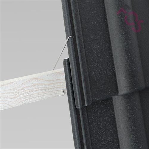 Fest um die Dachlatte geklemmt, greift das Auge der Klammer auf den äußeren Seitenfalz der oben liegenden Dachpfanne. Die optimierte Form der Klammer verhindert, dass sich die Klammer unter Belastung längt. Eine spezielle Verkrallung an der Dachlatte gewährleistet jederzeit sicheren Halt.