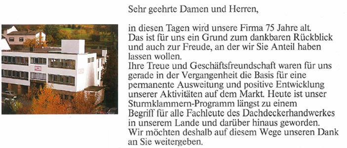 Expansion of the product range to include storm clips for the roofing trade, which form the main focus of production and sales today.