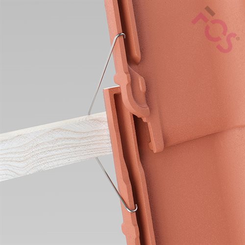 The sidelock clip 417® offers high resistance against wind uplift. One end of the clip is placed the furthest way down on the sidelock of the tile on top. The other end is brought behind the batten and placed on the sidelock of the tile below.