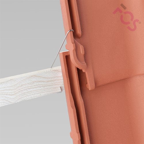 The 456®-2 is mounted onto the batten from the back. A special notch on the clip guarantees a secure hold on the batten at all times. The hook of the clip is placed in the outer sidelock of the roof tile. The clip holds three tiles in the four-tile corner. The optimised shape prevents the elongation of the clip under load. Single roof tiles secured with the 456®-2 can be replaced quickly and easily if damaged by weather or age.